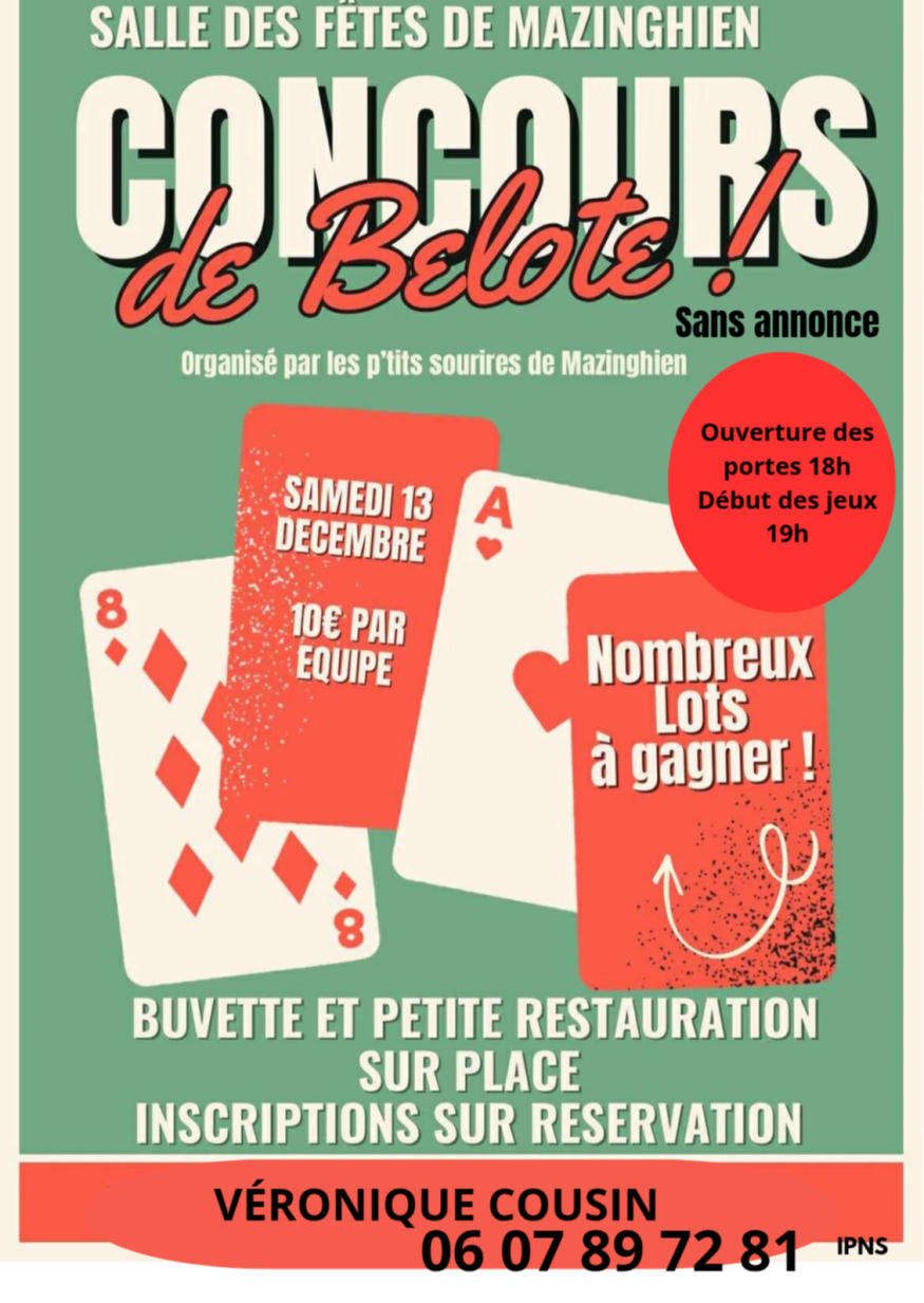 Les P'tits Sourires de Mazinghien organise un Concours de Belote à la salle des Fêtes de Mazinghien