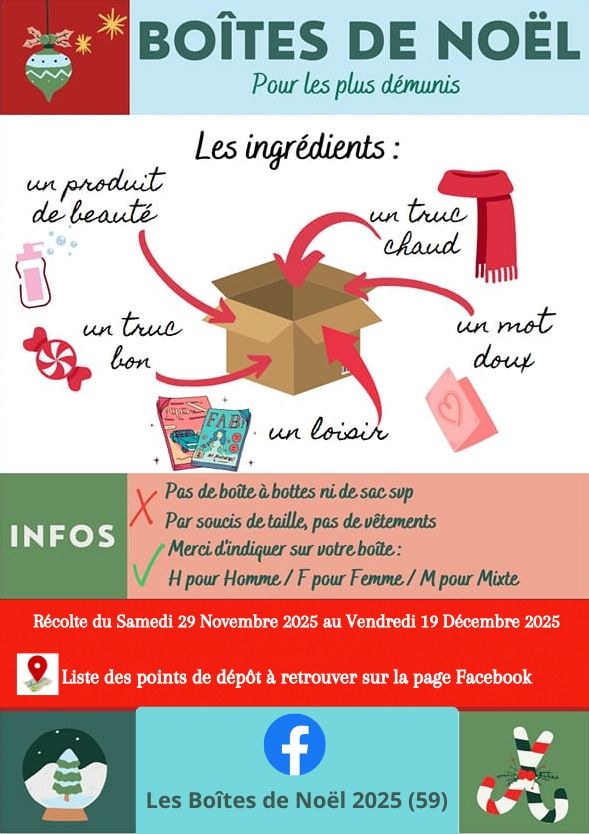 Où déposer ? Voici la liste officielle des points collectes pour le Cambrésis : sur la page FB Les Boites de Noël 2025 (59)