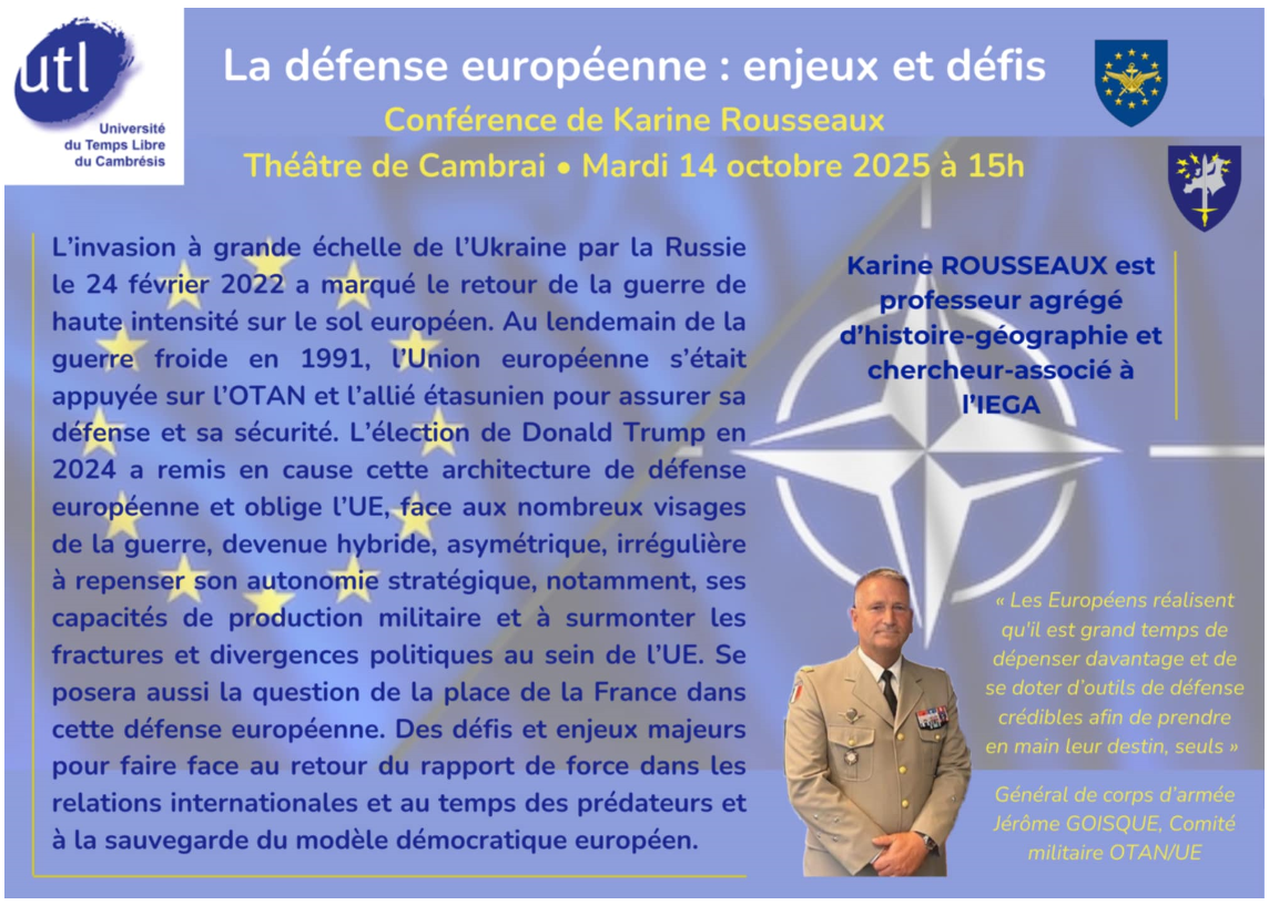 Conférence "La défense européenne : enjeux et défis" par Karine Rousseaux, professeur agrégé d'histoire-géographie et chercheur-associé à l'IEGA.