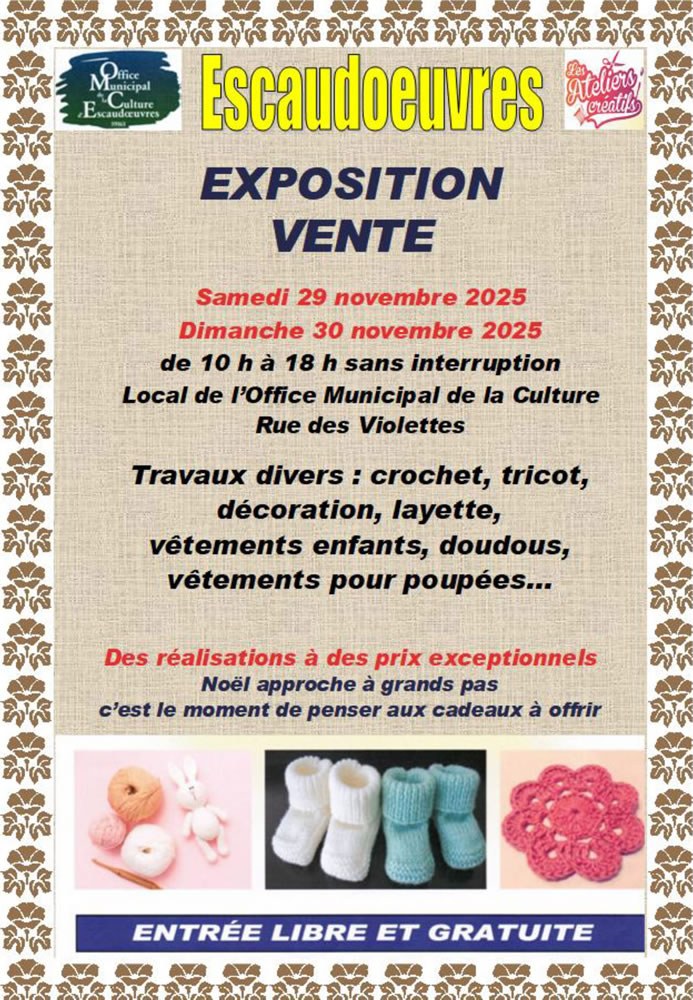 Les membres des ateliers créatifs de l'Office Municipal de la Culture d'Escaudœuvres exposent durant deux jours leurs travaux en tous genres (crochet, tricot, décoration, layette, vêtements enfants, doudous, vêtements pour poupées...). Vous aurez la possibilité d'acheter ce qui est exposé. Entrée libre.