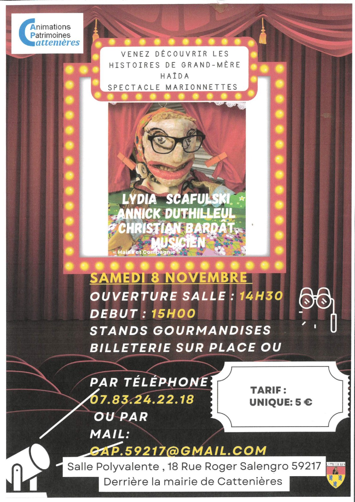 BILLETERIE SUR PLACE OU PAR TÉLÉPHONE : 07.83.24.22.18 / OU PAR MAIL: GAP.59217@GMAIL.COM